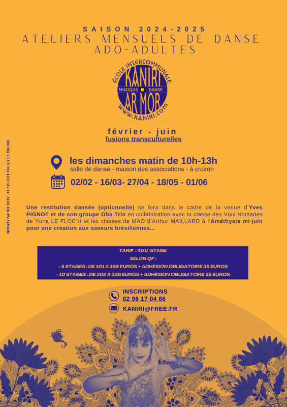Encadrés par Delphine AMICE , les cours de danse sont proposés sous forme de stages mensuels. Ils s'adressent aux enfants à partir de 12 ans ainsi qu'aux adultes.